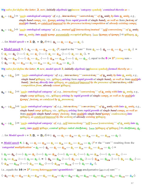 The combined human Phenome/human Genome's 'meta-Darwinian' '''speciation''' deploys as an historical progression of 'historical <<species>>' of human society, each <<species>> of which first becomes viable only at, and, perhaps, after, a certain, '<<speci>>-fic' stretch of the human-historical time continuum, grasped as the [dis-]continuum of the 'qualo-quantitative growth' of the human-societal self-force of human society-self-re-production, when 'society-productive force' sufficient for its sustained existence first arises.